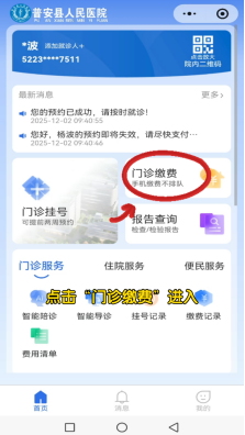 步骤:点击门诊缴费→选择待缴费项目→选择支付方式→确认付款→支付完毕→到相应科室进行检查或取药