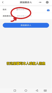 2.第一次使用微信小程序功能,需在进行个人基本信息注册,点击“添加就诊人”根据提示,输入姓名、身份证号。