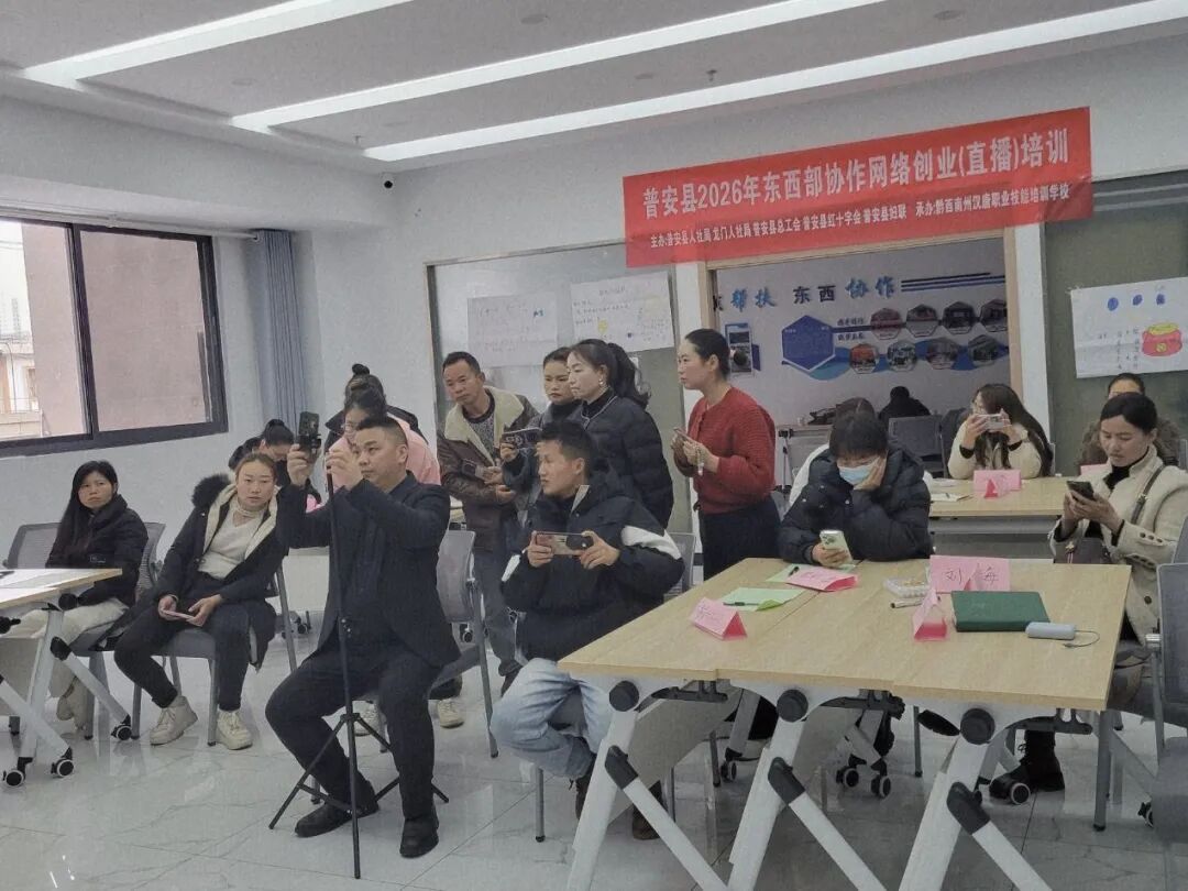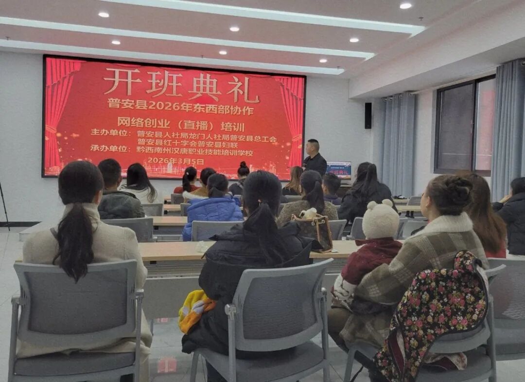 为扎实推进职业技能提升行动,精准破解群众在网络创业过程中面临的入门难、缺技术、无方向等实际问题,助力群众依托直播电商新业态拓宽增收渠道、实现创业致富,3月5日,普安县2026年第一期网络创业(直播)培训班在县人力资源市场二楼培训室正式开班。本次培训共吸引26名有创业意愿的群众参加,学员们将开启为期7天的系统化、专业化学习。