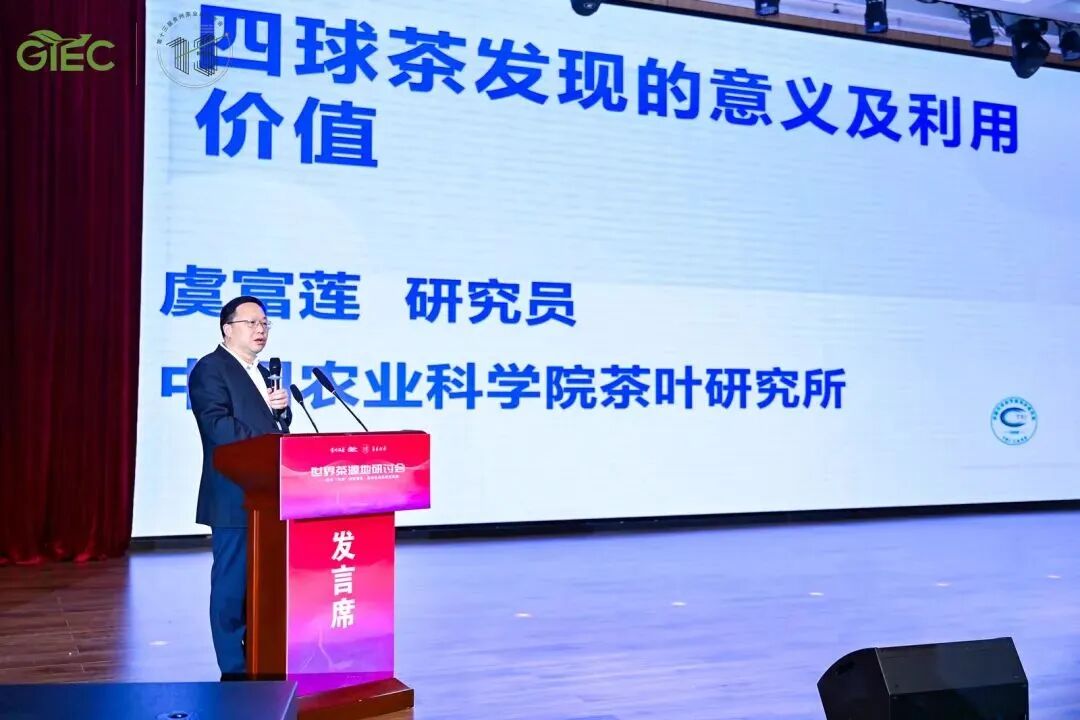 安徽农业大学讲师朱俊彦代安徽农业大学茶树生物学与资源利用国家重点实验室常务副主任韦朝领宣读《基于分子群体遗传学的四球古茶(大大厂茶)分类与鉴定保护》主旨报告